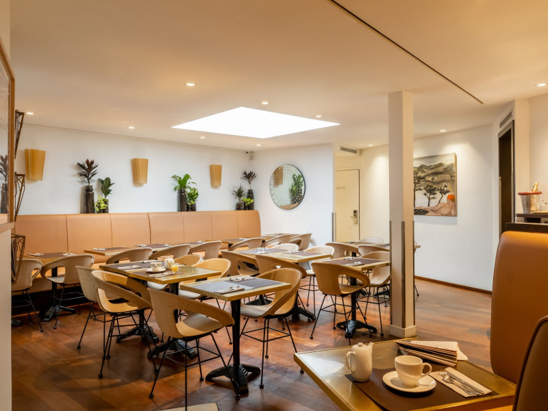 Le bar-salon propose un décor contemporain, des couleurs neutres et du parquet et offre une ambiance décontractée et paisible. Venez prendre un verre et vous détendre à la fin de votre journée à Paris au bar-salon de l'Hôtel Le Colisée.