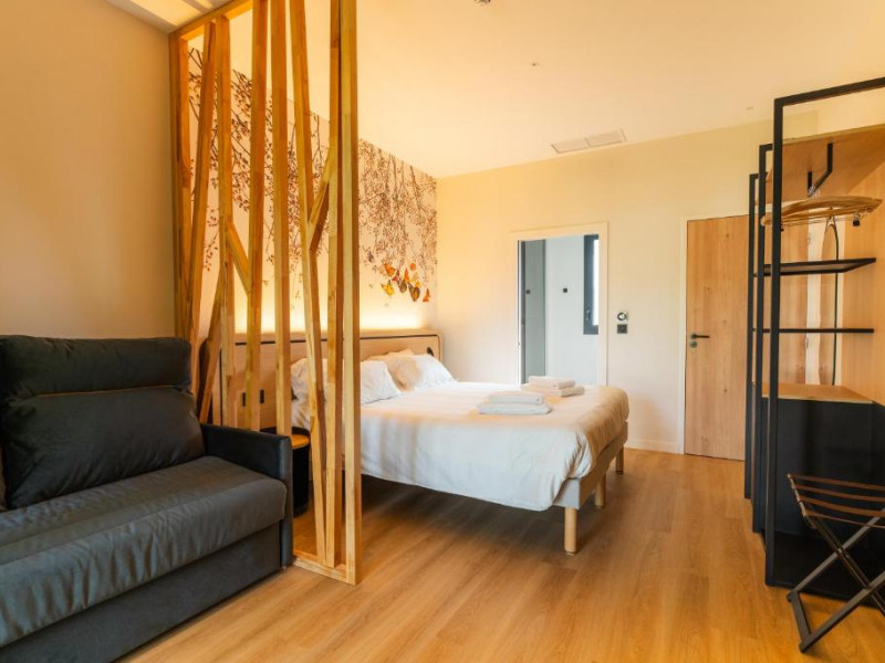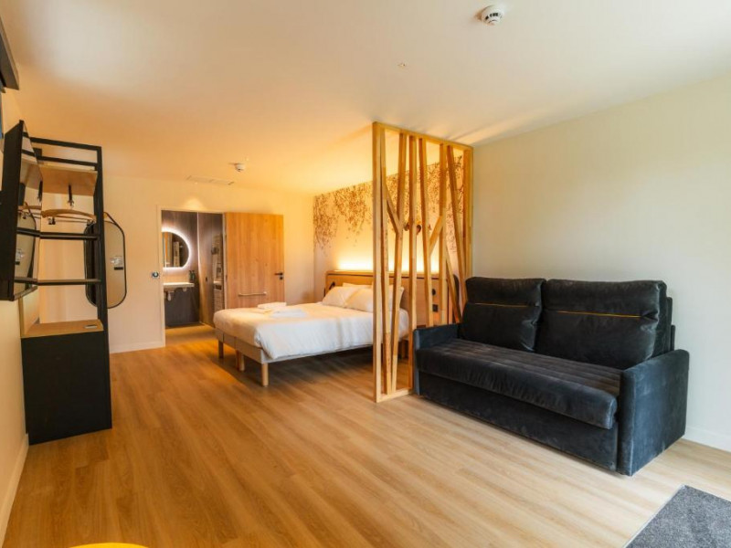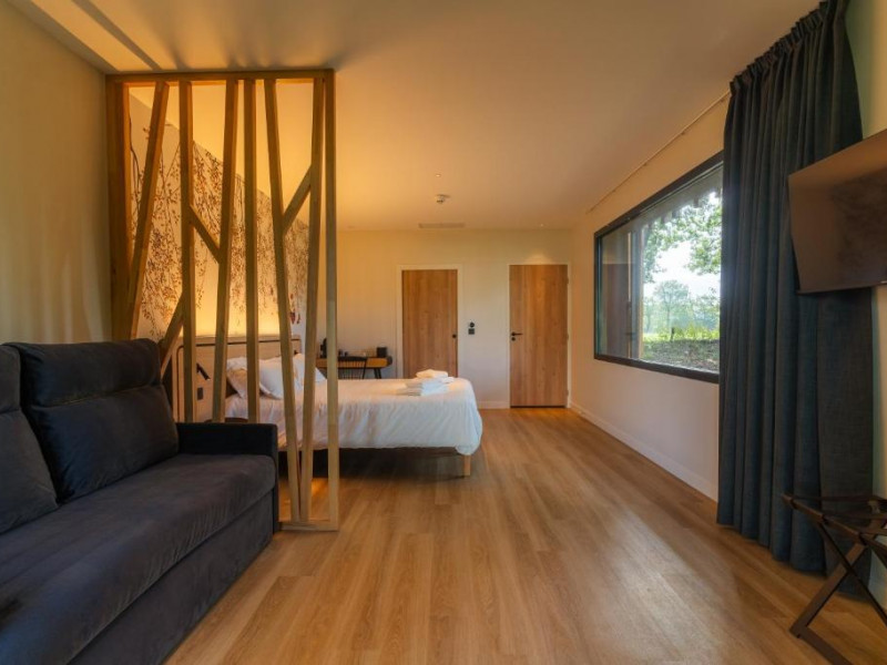 - Chambre familiale : situées au rez-de-chaussée, avec accès direct au parc. Espace salon pouvant accueillir deux personnes à dormir, une chambre et une terrasse privative.