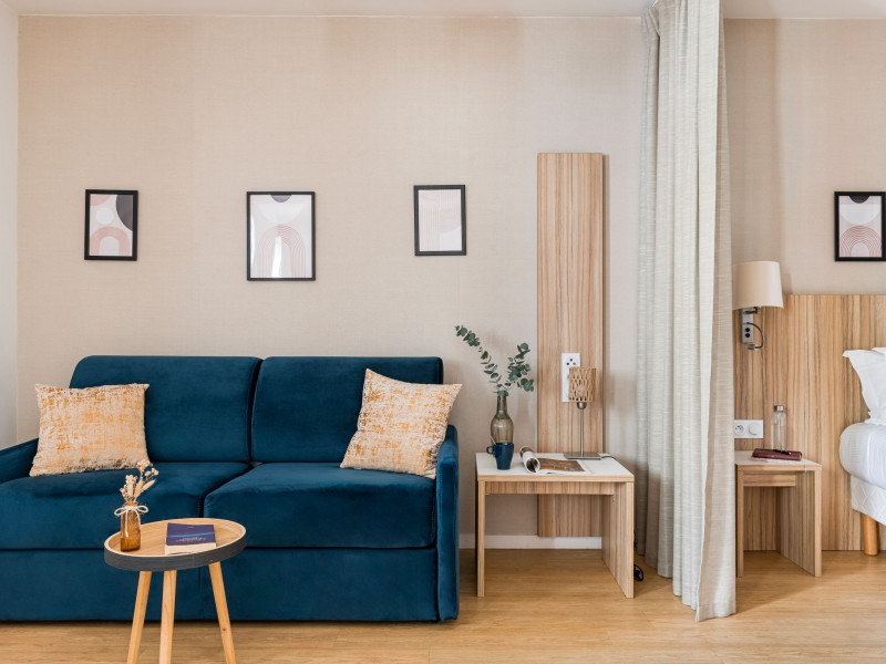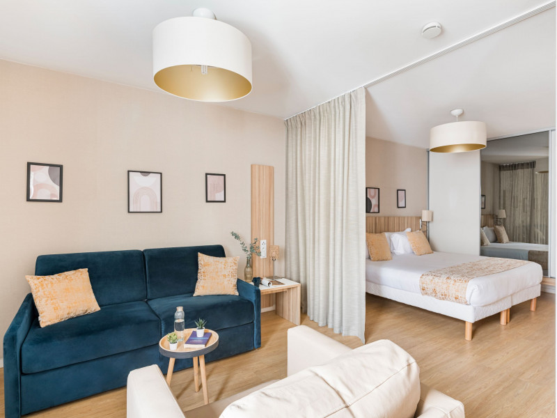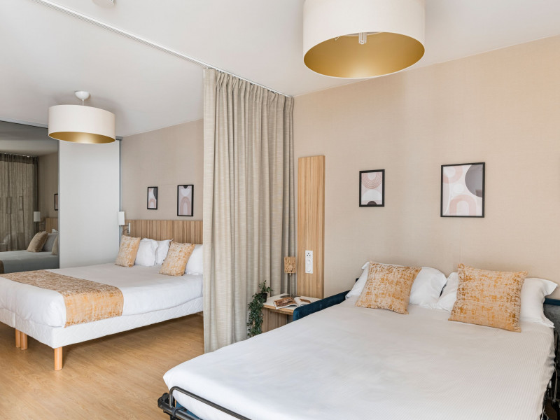 - Suite familiale: 34 m2, coin salon/détente avec canapé modulable en lit, et pouvant accueillir une famille jusqu'à 4 personnes