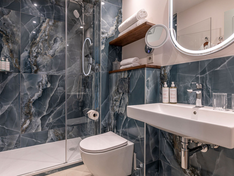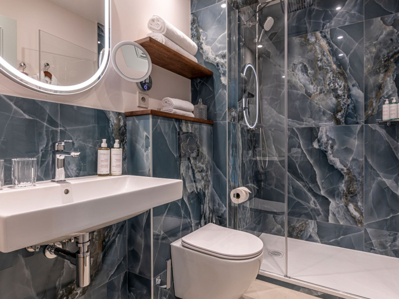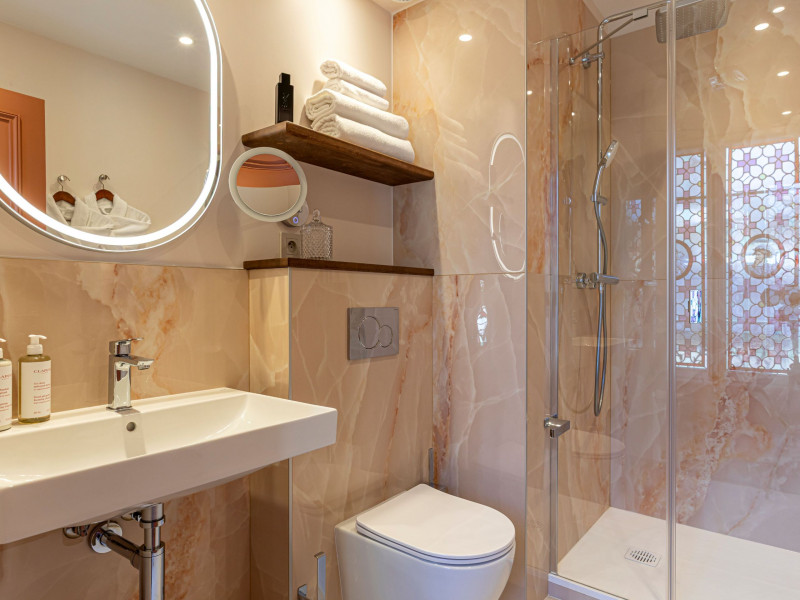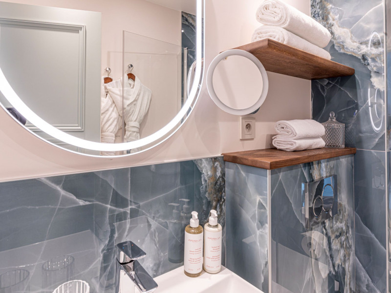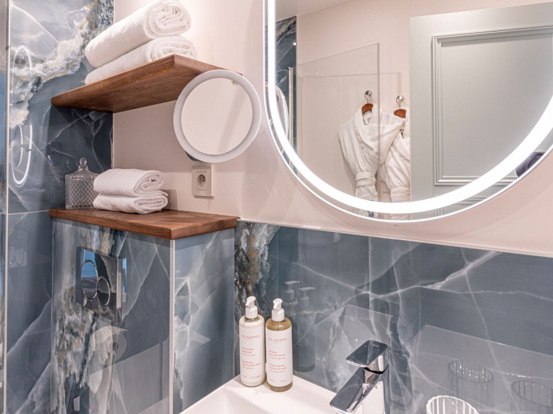 - Salle de bain avec produits d'accueil Clarins, peignoirs, chaussons, sèche-cheveux