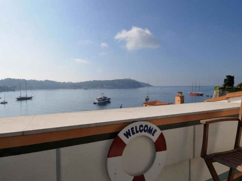 La façade de l'hôtel Welcome surplombe le petit port de pêche de Villefranche-sur-Mer et se reflète dans les eaux bleues de la mer Méditerranée. Cet ancien couvent du XVIIe siècle, transformé en hôtel au début du XIXe siècle, offre une vue unique sur la baie de Villefranche et le Cap-Ferrat.